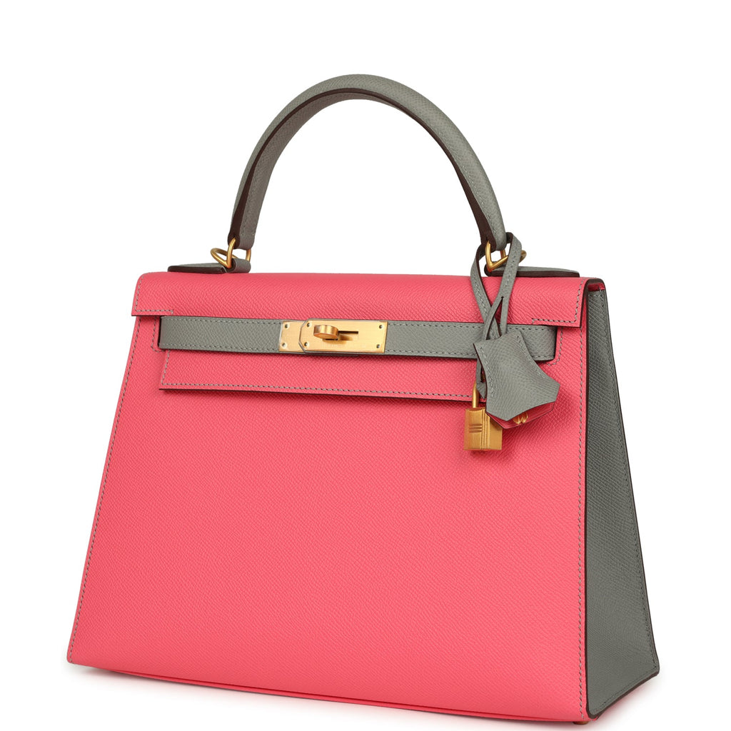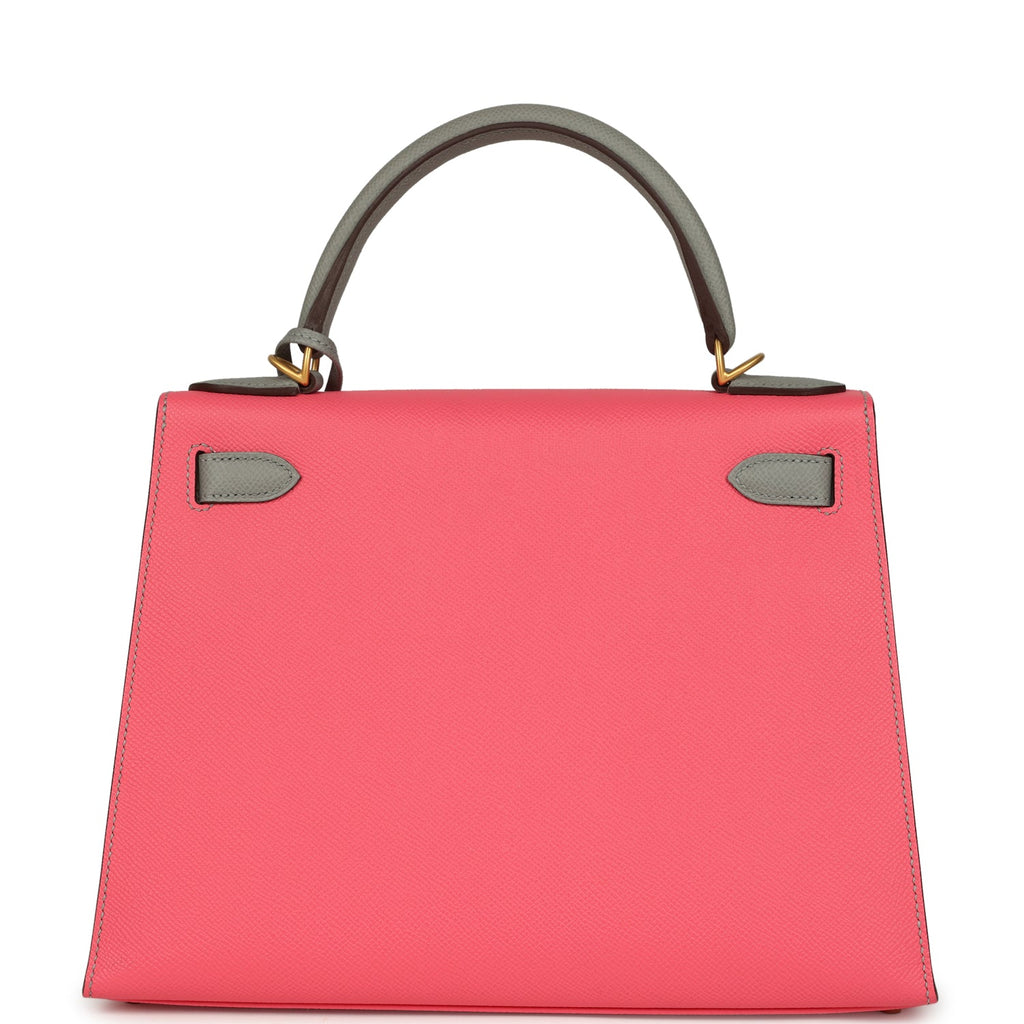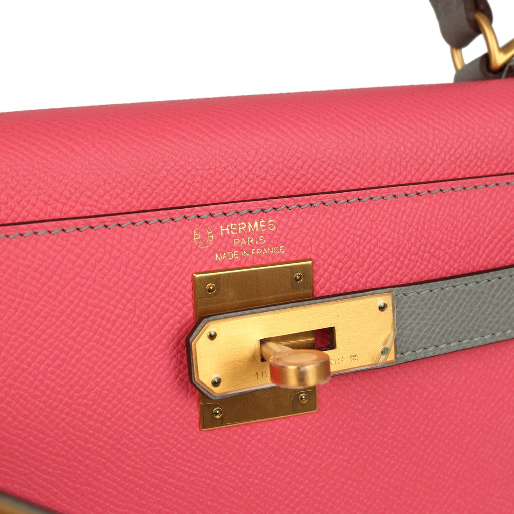 Hermes Special Order (HSS) Kelly Sellier 28 Rose Azalee and Gris Mouette Epsom Brushed Gold Hardware
