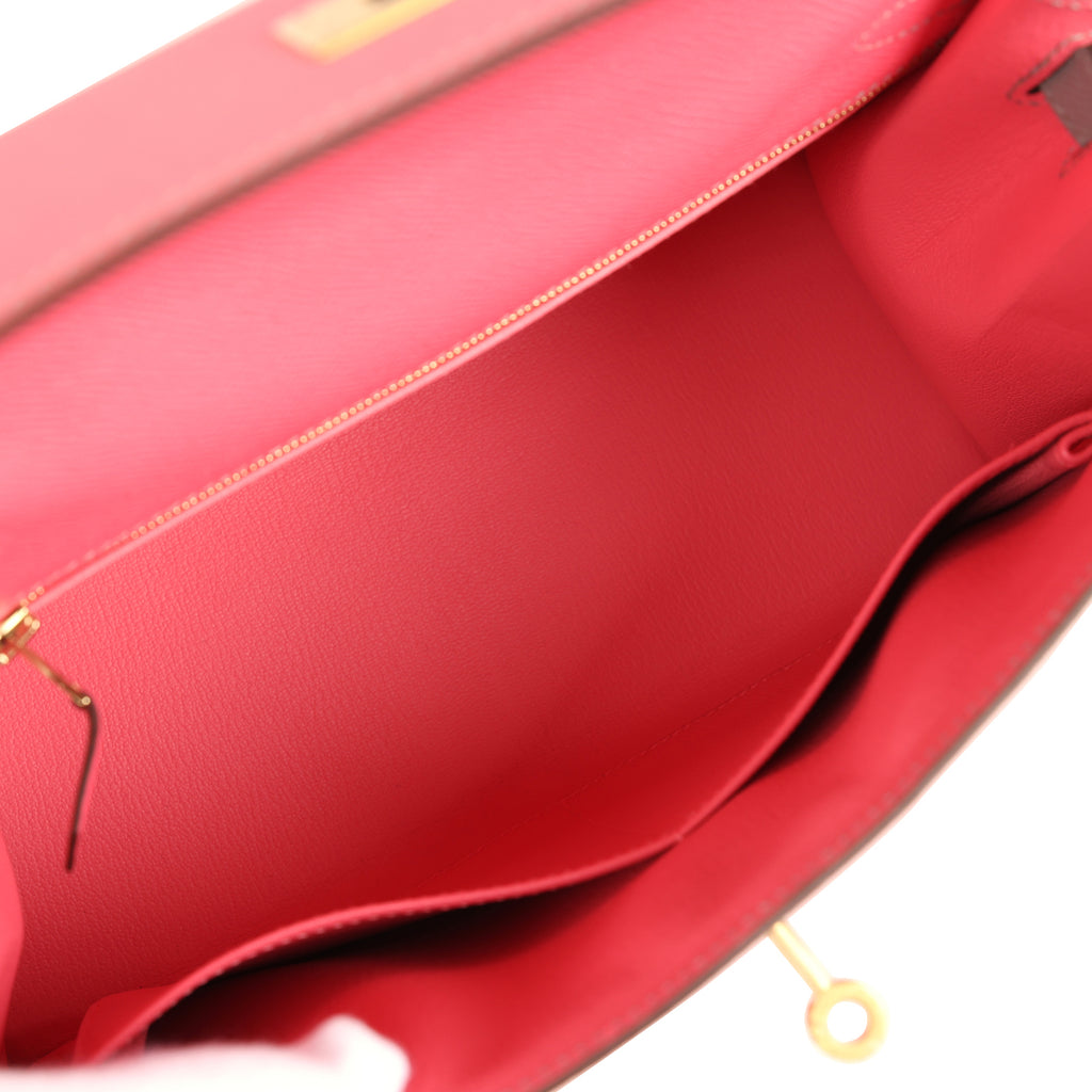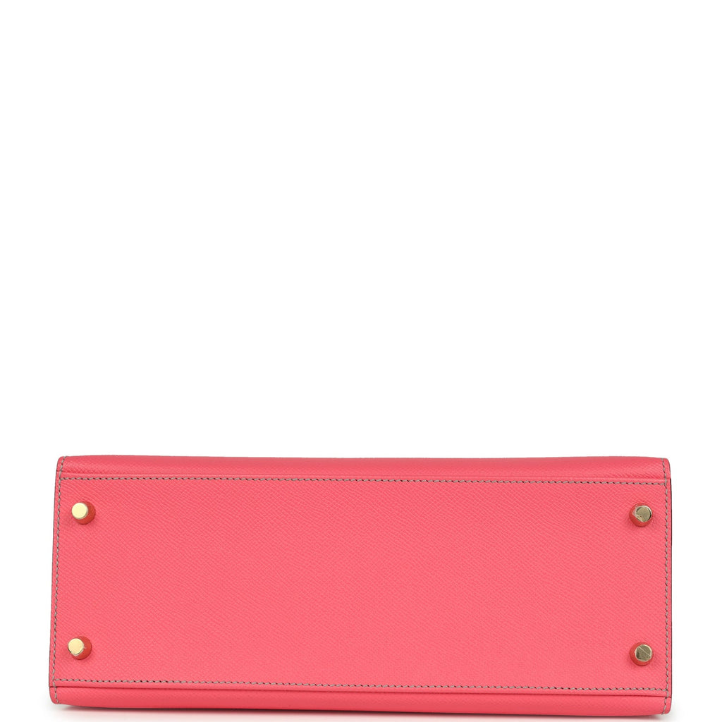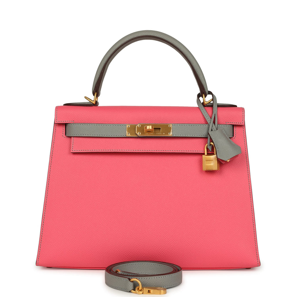 Hermes Special Order (HSS) Kelly Sellier 28 Rose Azalee and Gris Mouette Epsom Brushed Gold Hardware