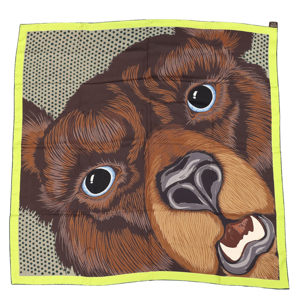 Hermes “Yellowstone Forever Grrrrr!” Marron/Lime/Sapin Silk Scarf 100cm