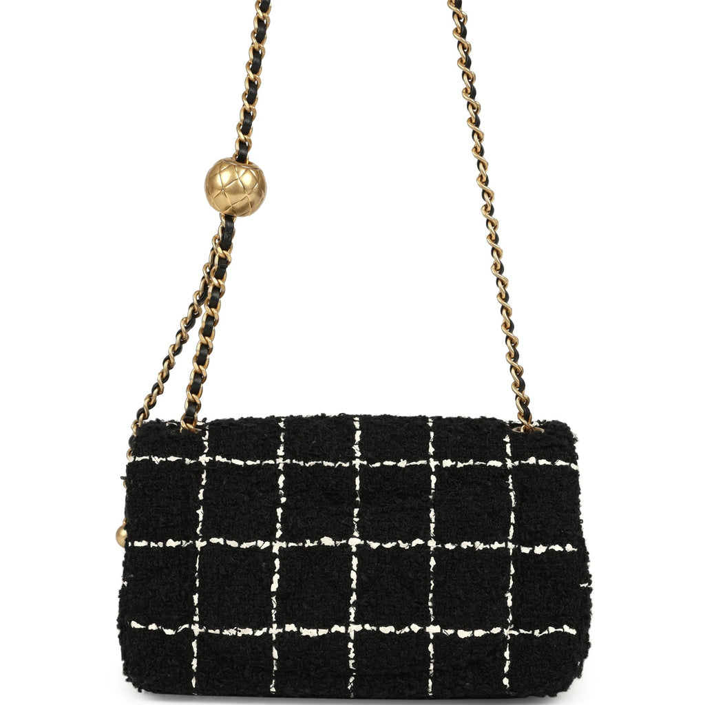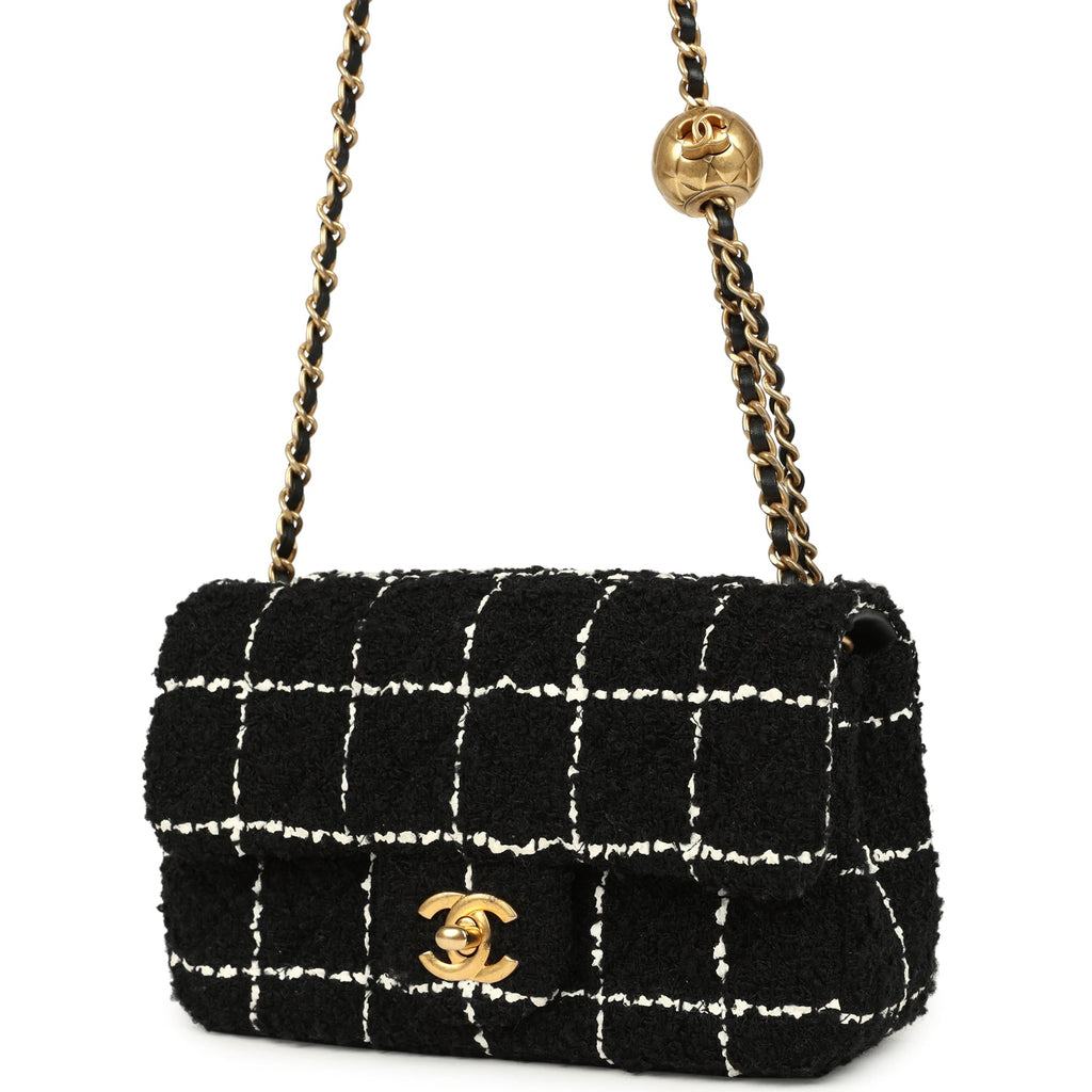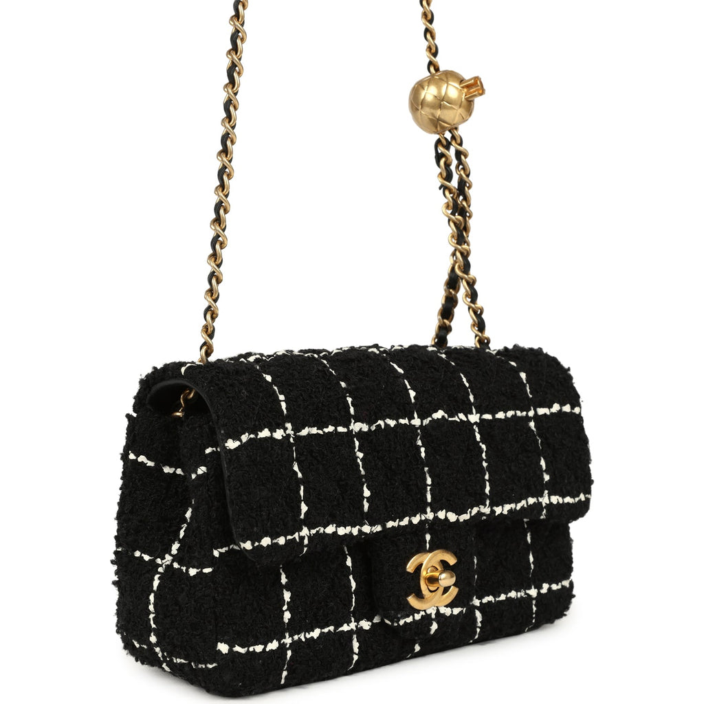 Pre-owned Chanel Mini Pearl Crush Square Flap Bag White and Black Tweed Antique Gold Hardware