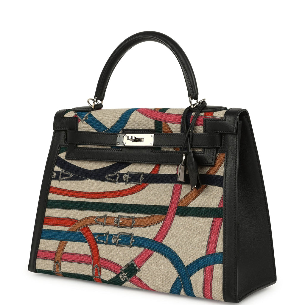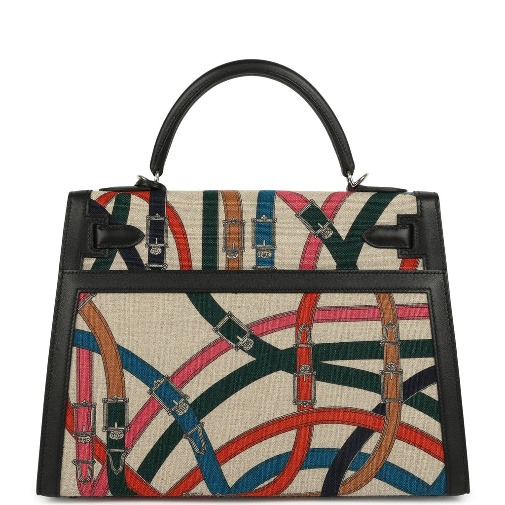 Pre-owned Hermes Kelly Sellier 32 Ficelle-Multicolor Toile De Camp Cavalcadour and Black Swift Palladium Hardware