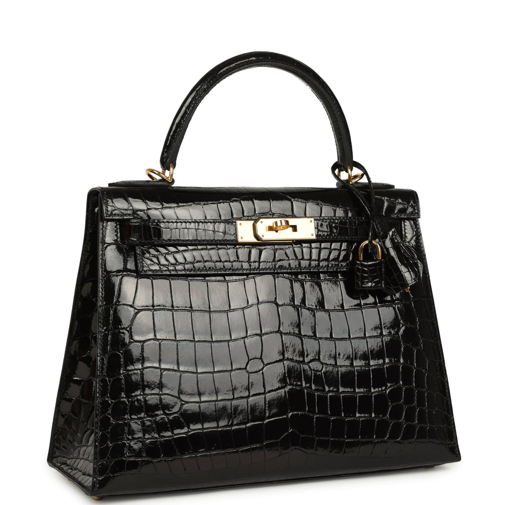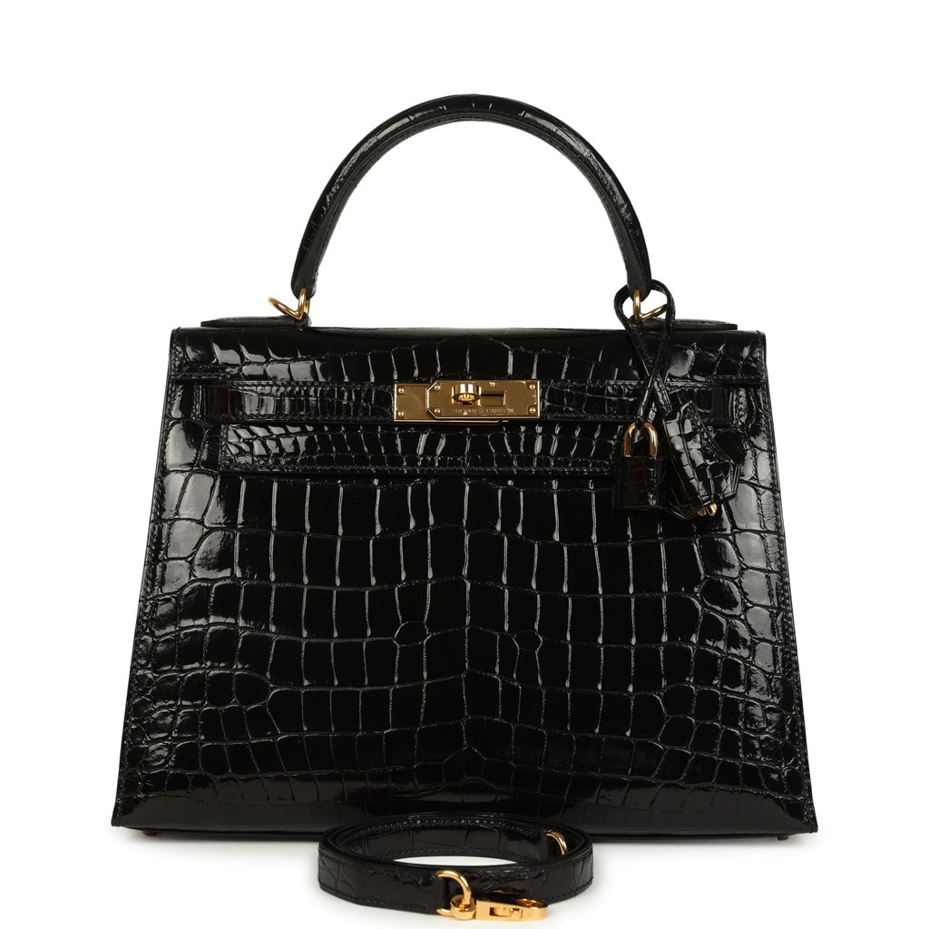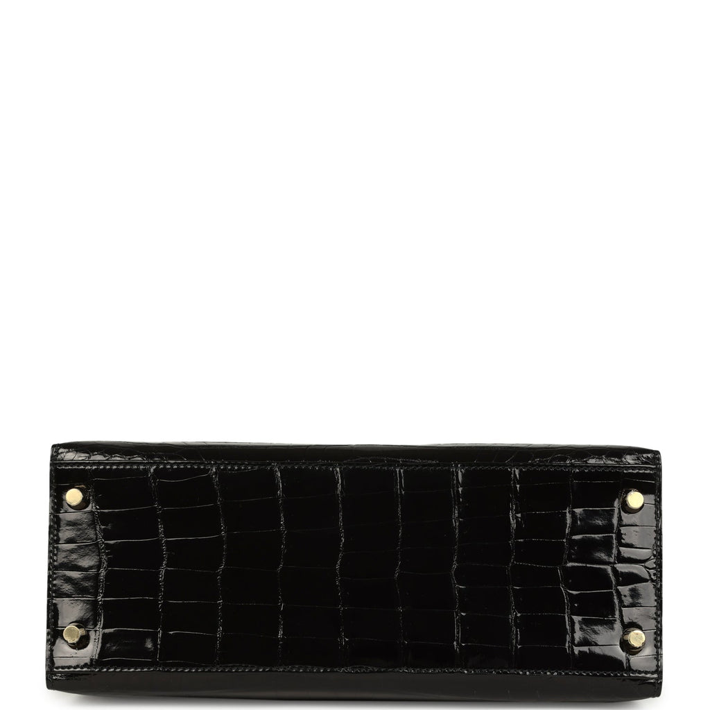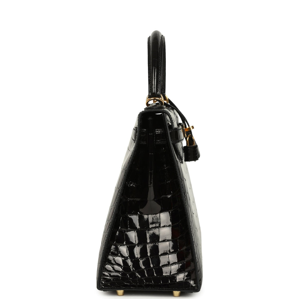 Pre-owned Hermes Kelly Sellier 28 Black Shiny Niloticus Crocodile Gold Hardware