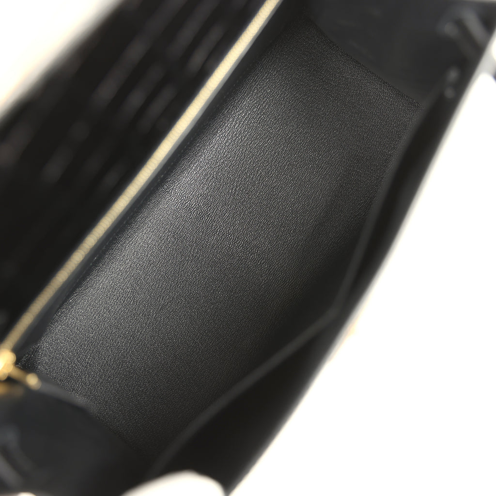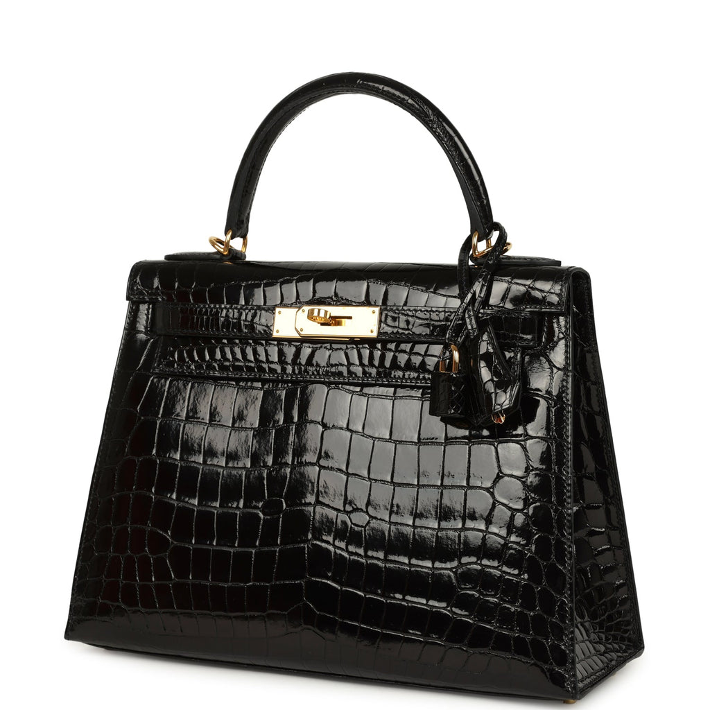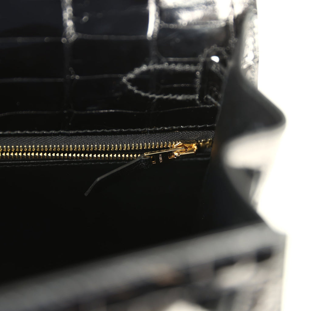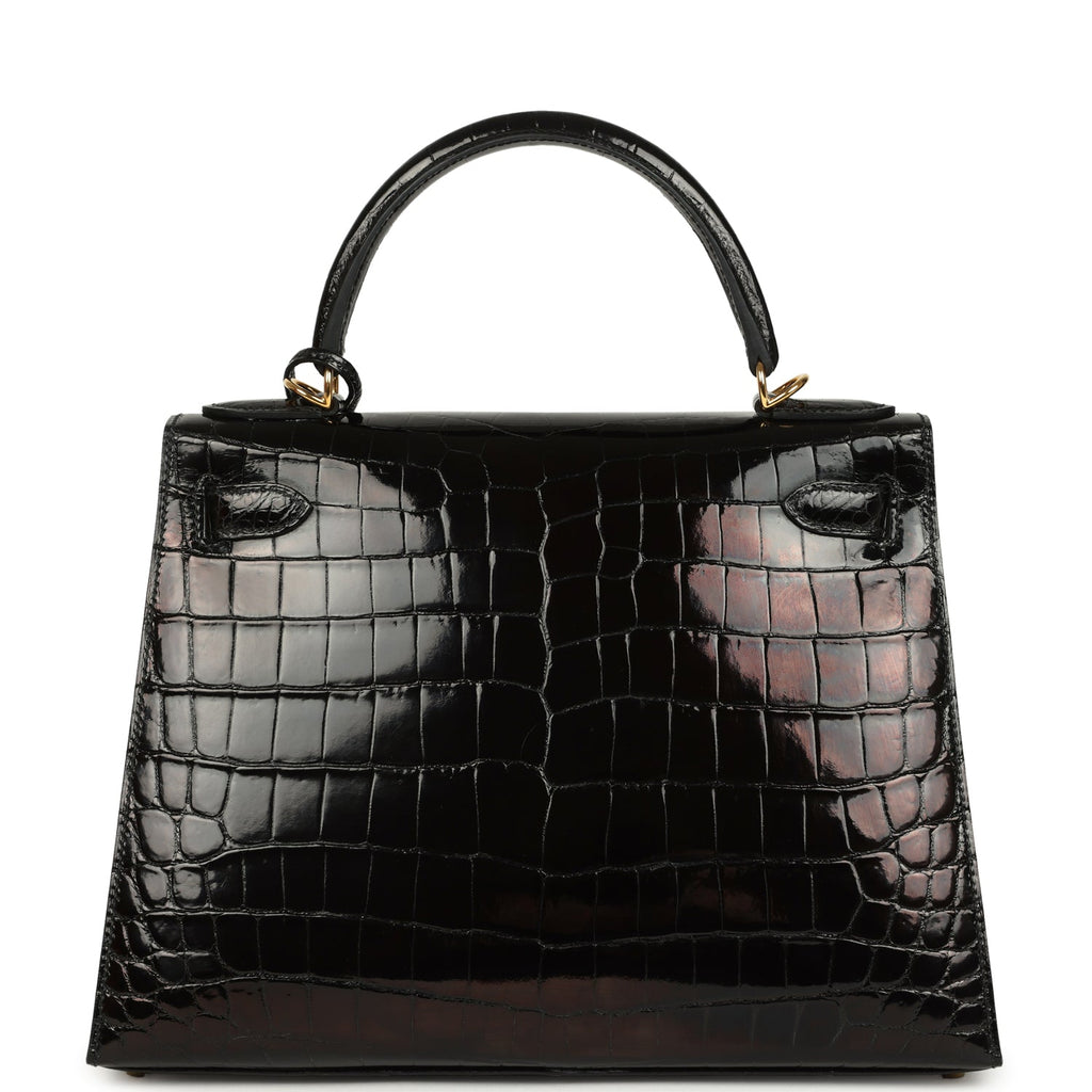 Pre-owned Hermes Kelly Sellier 28 Black Shiny Niloticus Crocodile Gold Hardware
