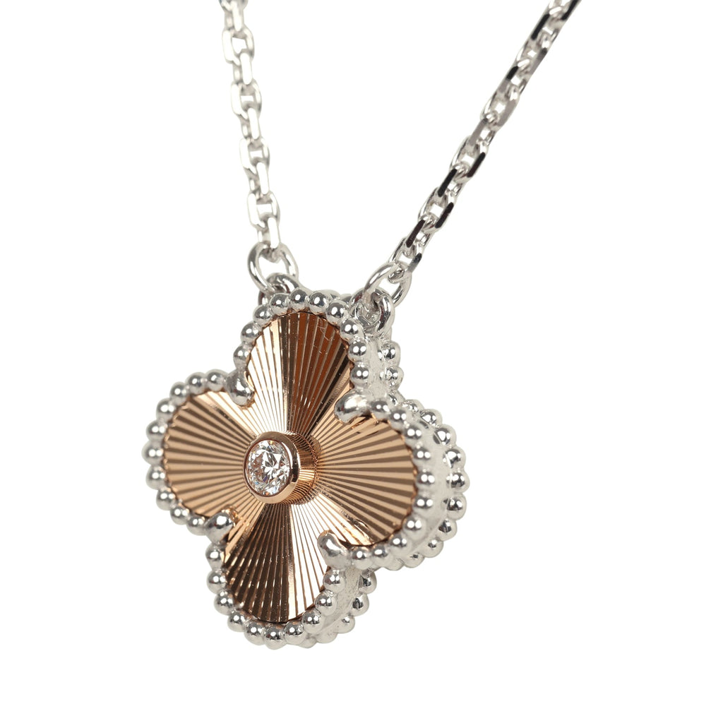 Pre-owned Van Cleef & Arpels 2024 Holiday Vintage Alhambra Pendant Necklace Rose Gold Guilloche 18K White Gold & Diamonds