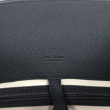 The interior is lined in black calfskin leather and beige canvas and has two interior card slots and one interior zip pocket.