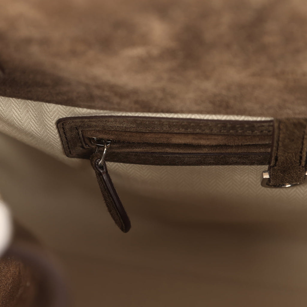 The interior is lined in Nut Brown suede leather and beige canvas and has two interior card slots and one interior zip pocket.