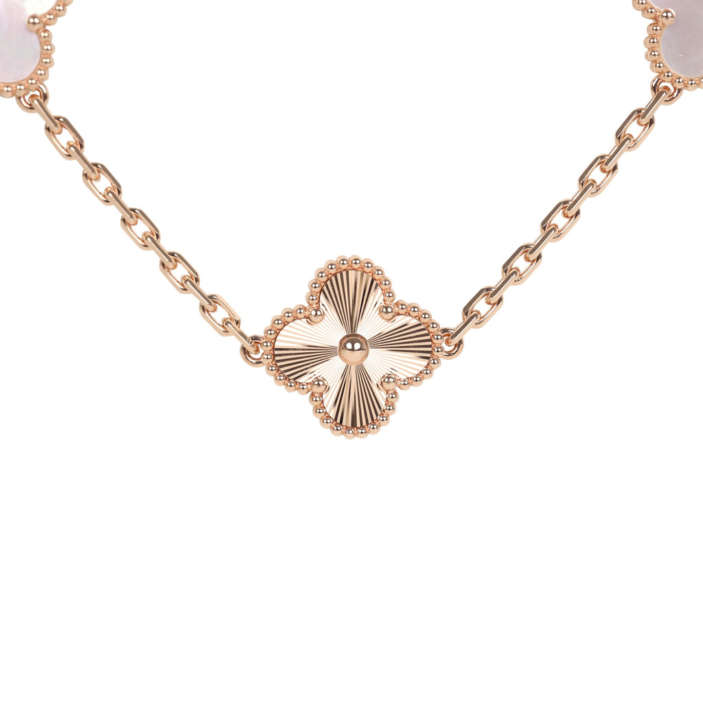 This Limited Edition Seoul Maison Van Cleef & Arpels Vintage Alhambra 20 Motif necklace is in white mother of pearl and 18k Guilloche rose gold hardware with ten white mother of pearl clover motifs and ten Guilloche rose gold clover motifs and a hallmark lobster claw clasp closure.