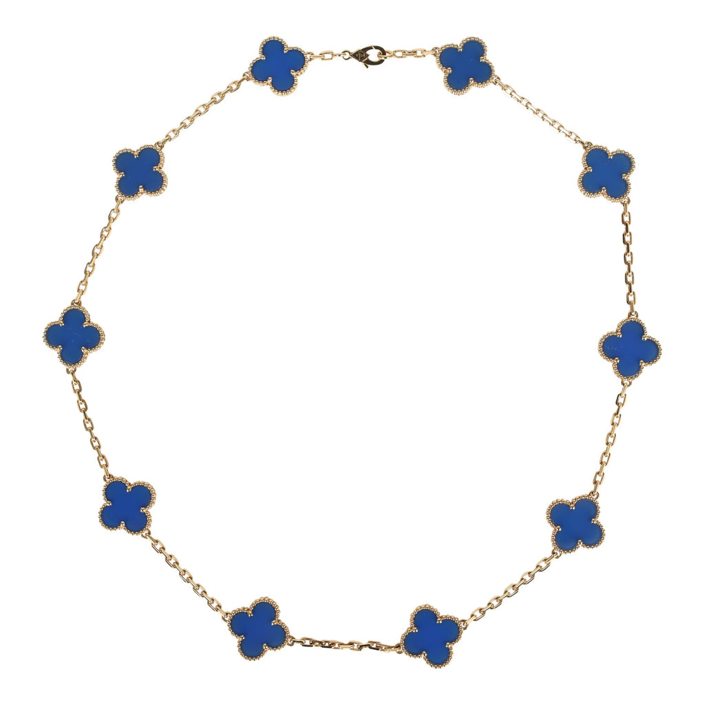 Van Cleef & Arpels Vintage Alhambra 10 Motif Necklace Blue Agate 18K Yellow Gold Hardware