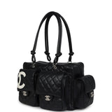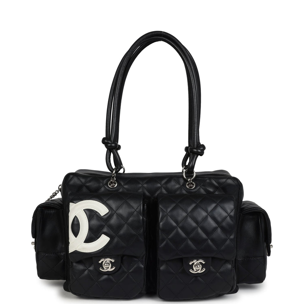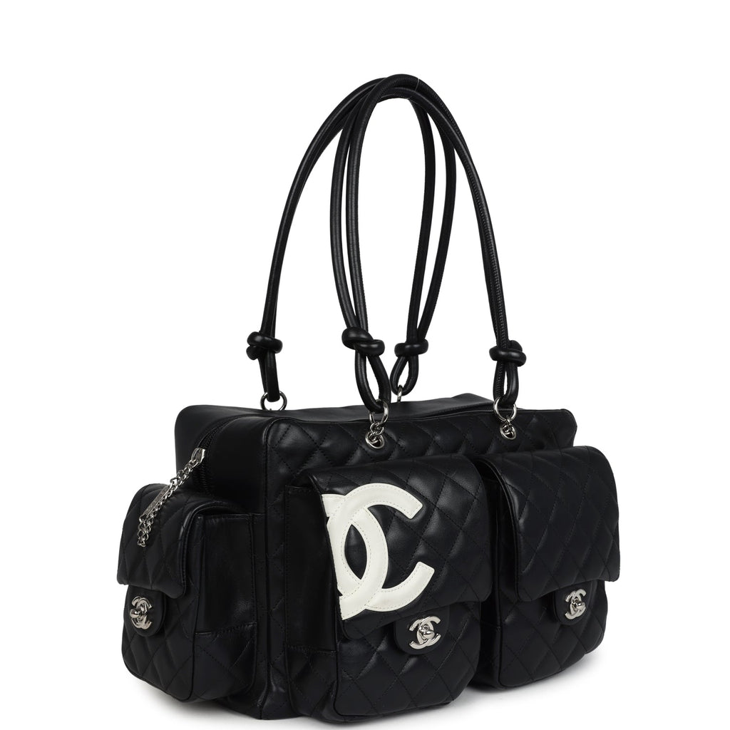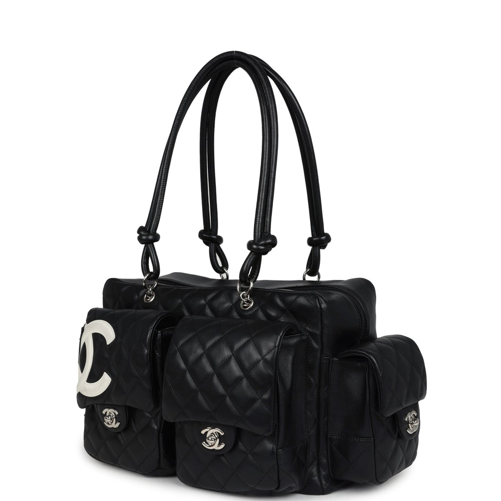 Vintage Chanel Large Cambon Ligne Reporter Bag Black and White Lambskin Silver Hardware