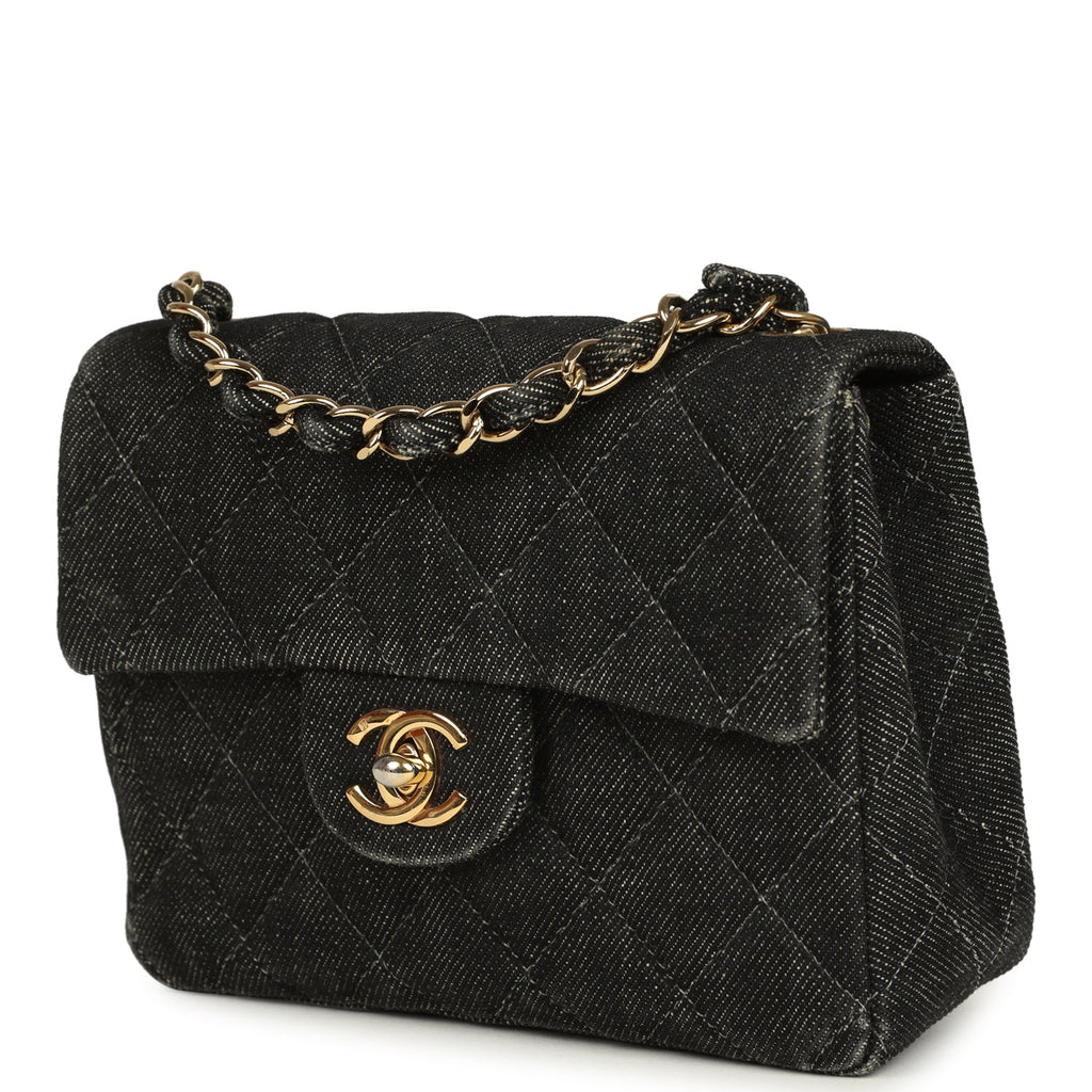 Vintage Chanel Mini Square Flap Bag Black Denim Gold Hardware