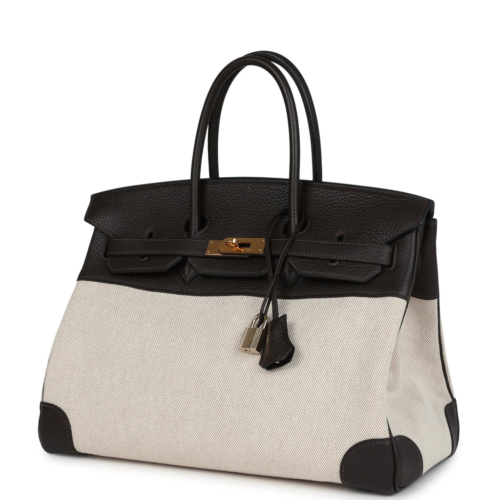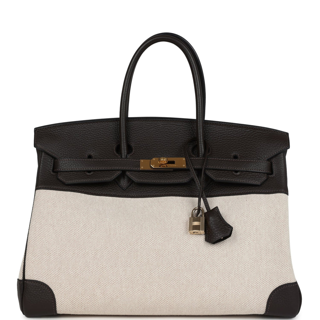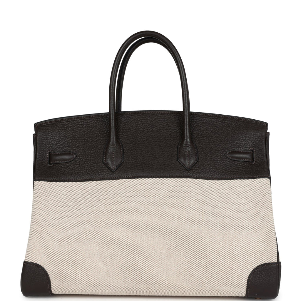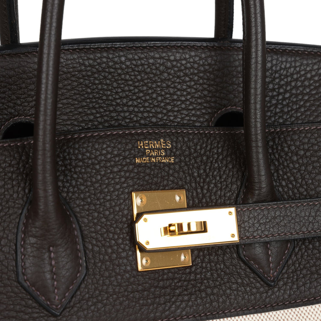 Pre-owned Hermes Birkin 35 Ebene Clemence and Ecru-Beige Toile H Canvas Gold Hardware