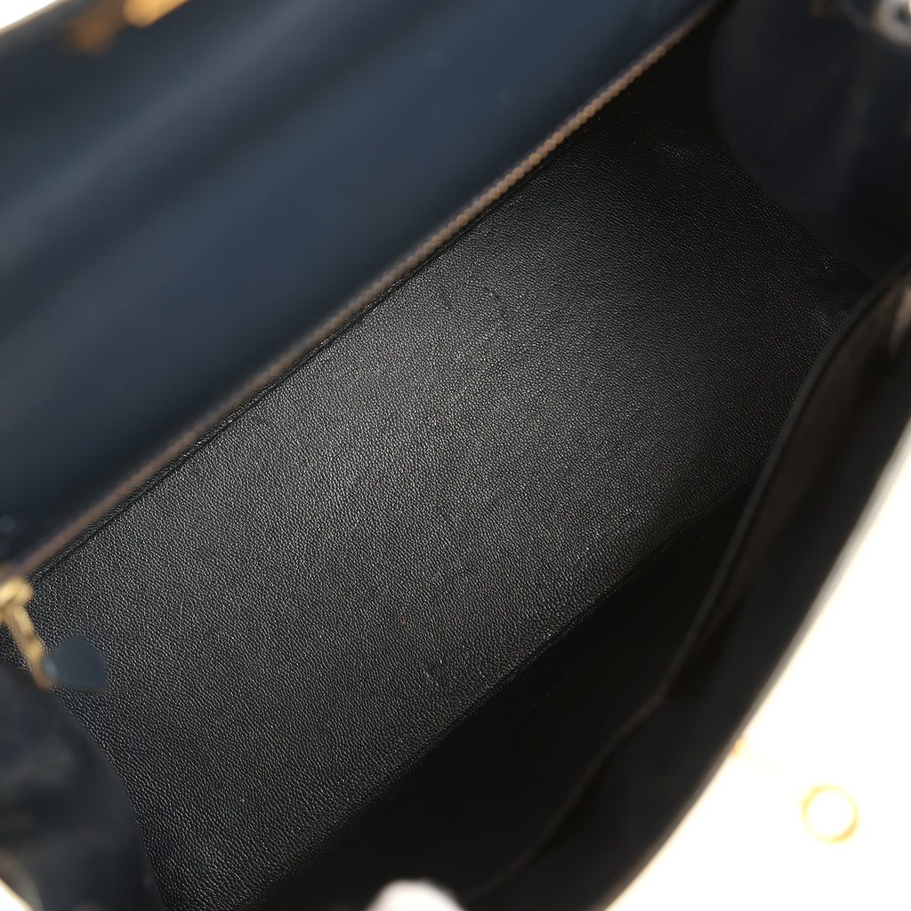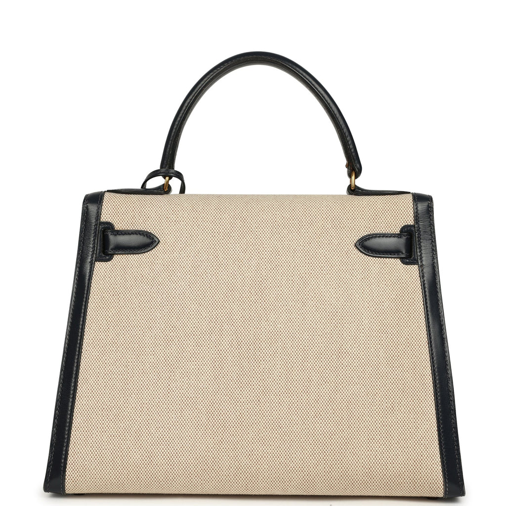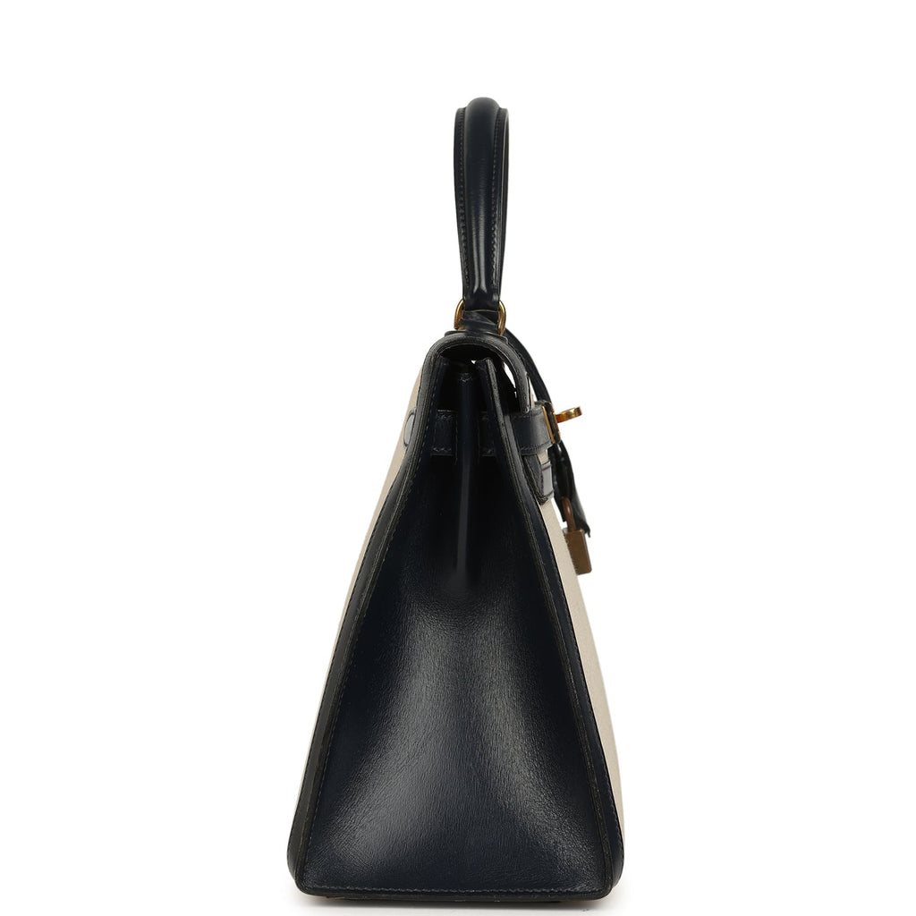 Vintage Hermes Kelly Sellier 28 Bleu Marine Box and Beige-Ecru Toile H Canvas Gold Hardware
